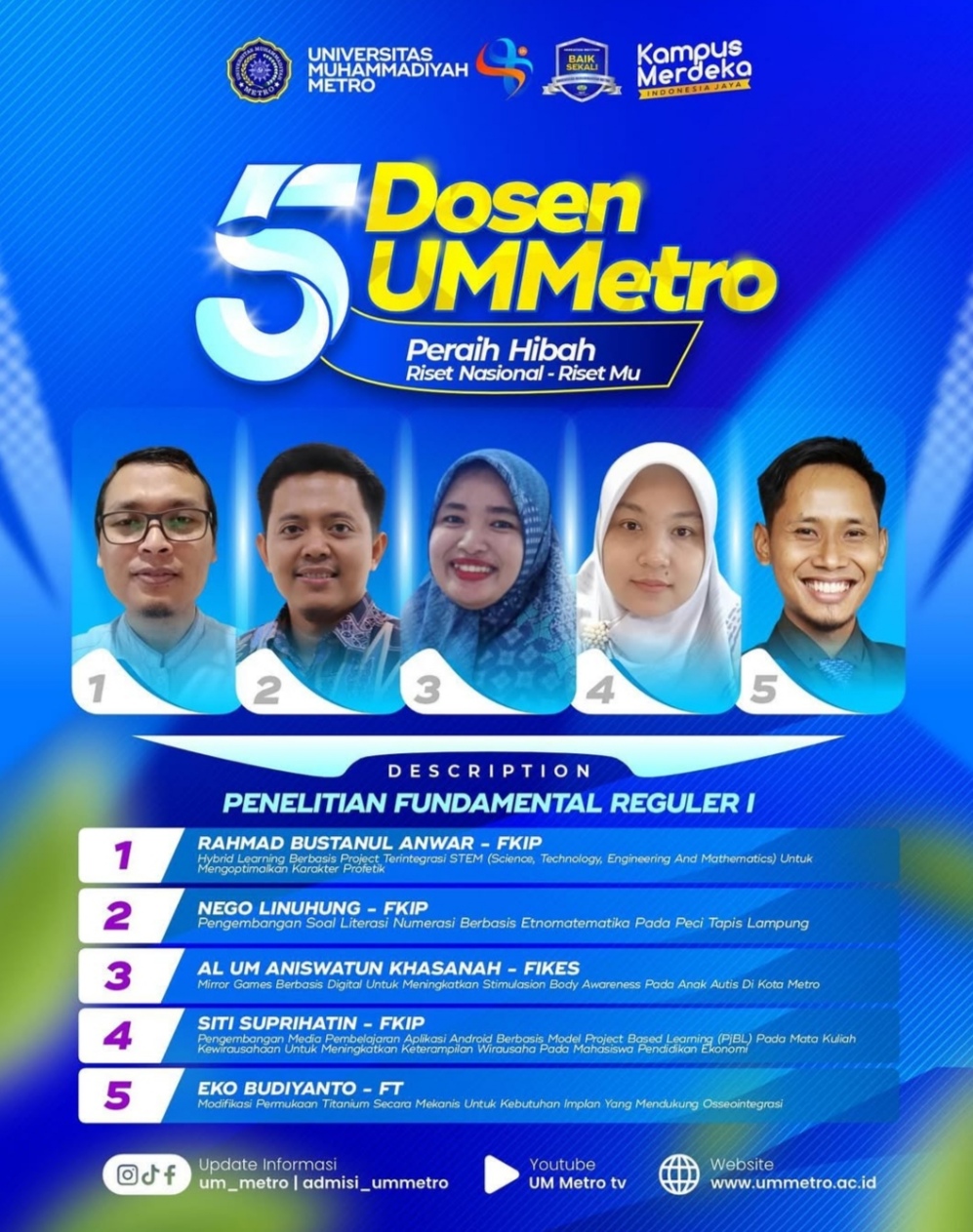Selamat dan Sukses! untuk Lima dosen terbaik Universitas Muhammadiyah Metro berhasil meraih hibah Riset Nasional-RisetMu!